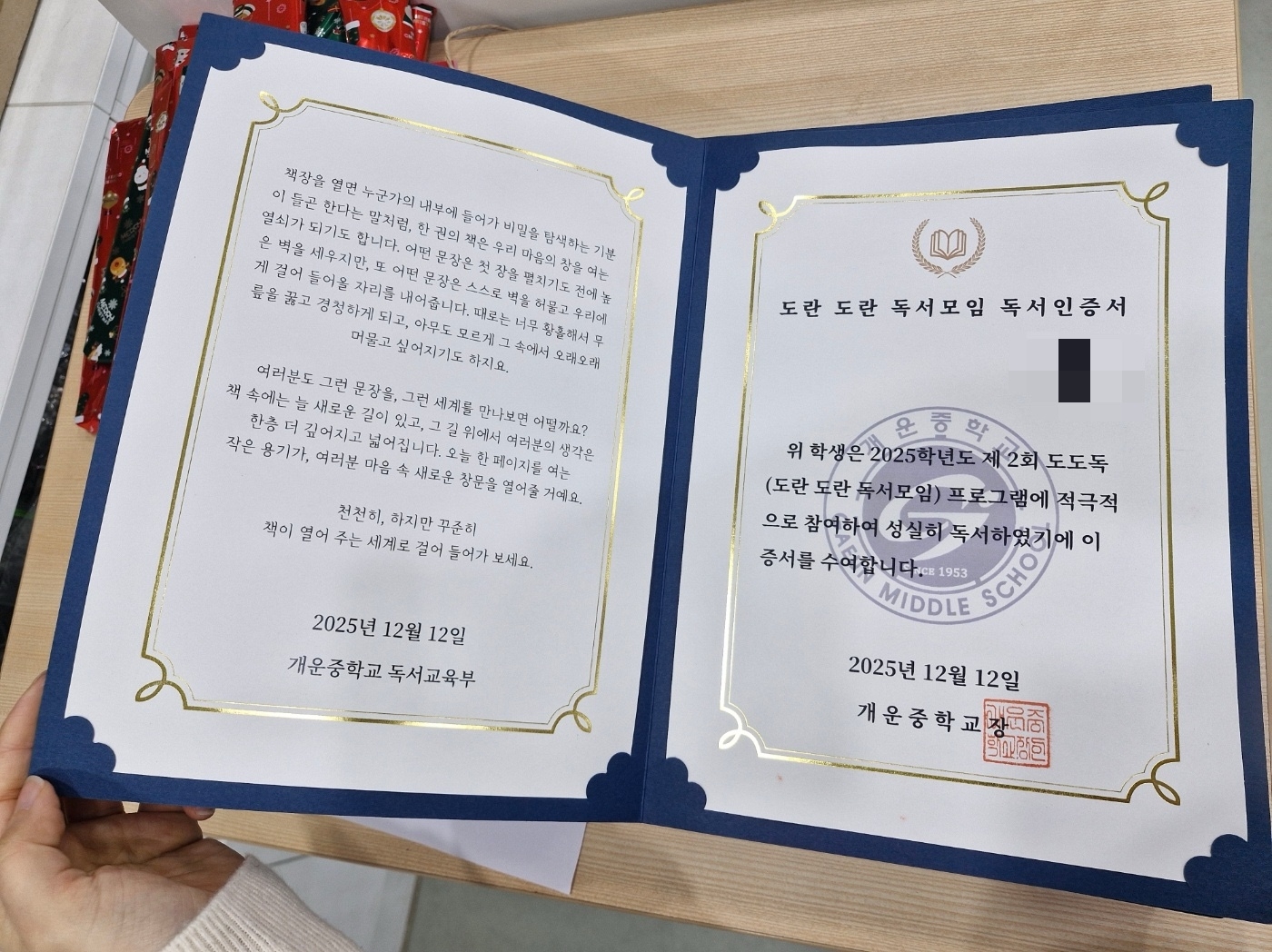 12월 12일 제2회 도란도란 독서모임 독서인증서 수여식이 있었습니다.